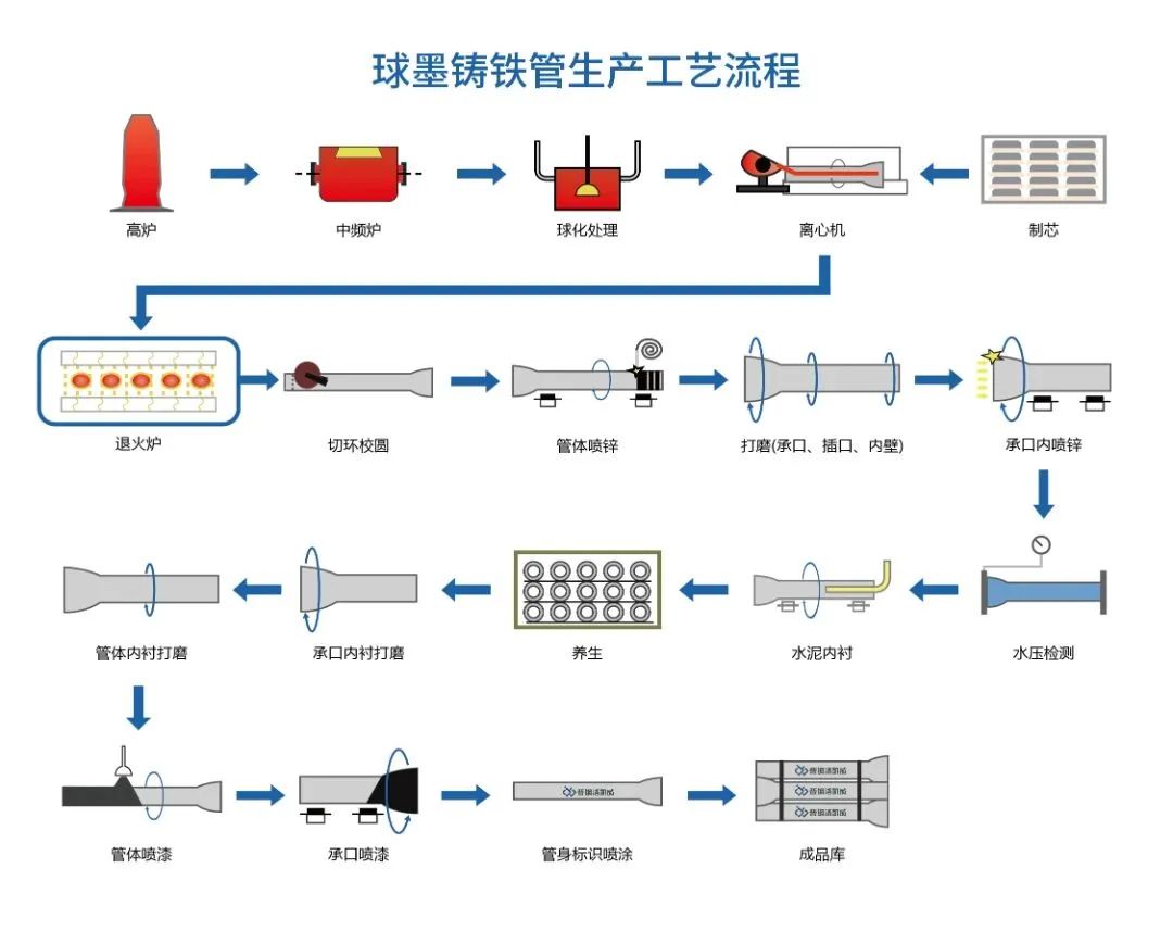 球墨铸铁管的具体退火温度及保温时间是由不同的化学成分和铸态组织所决定的,对不同生产工艺条件的铸管,其退火工艺是不同的,由试验决定。